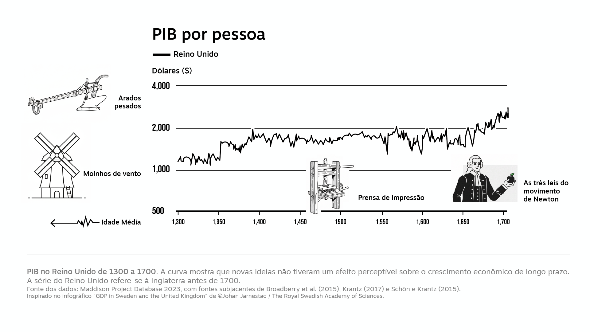 Afinal, durante a maior parte da história humana, avanços técnicos não se traduziram em crescimento sustentado da renda por pessoa. A série histórica para a Inglaterra antes de 1700 mostra longos platôs, apesar de invenções como o arado pesado e os moinhos. A partir do fim do século 18, o padrão muda. Reino Unido e, depois, Estados Unidos entram numa trajetória de expansão quase contínua, com taxas médias anuais em torno de 1% a 2%, o suficiente para multiplicar o nível de vida em poucas gerações. Essa virada é o ponto de partida comum dos laureados: entender o que permitiu a decolagem e o que a mantém.